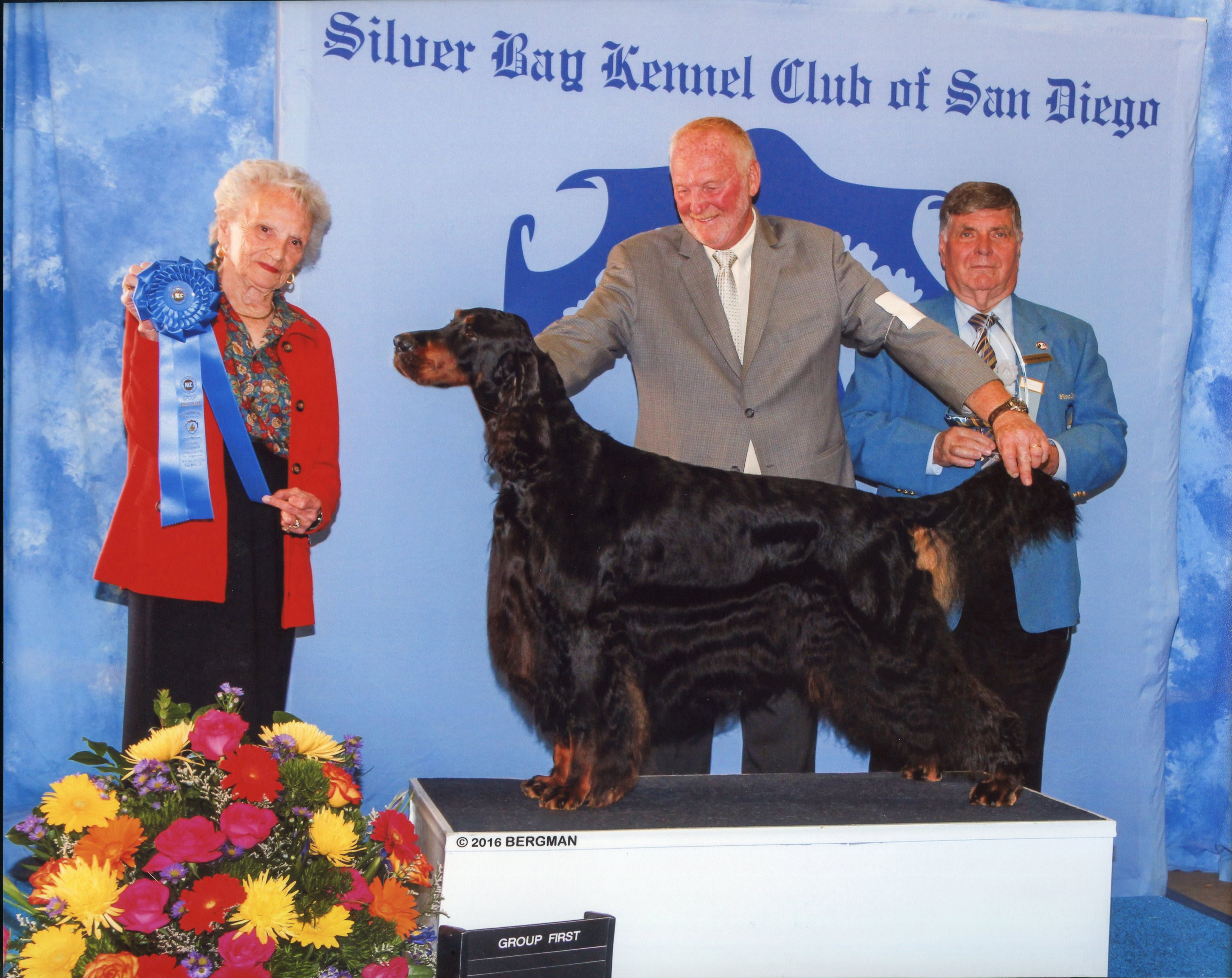 gORDON SETTER GCH CH TIMBARARY N' SASTYA'S OUTLAW JH CD, SR69945201 9/30/2011, Breeder: Barbara Meining DVM. By GCH Sastya's Eleven Eleven -- GCH Timbarary's Intuition UD JH. Pat Boldt & Mary Ann Leonard & Barbara Meining DVM. Dog. Bruce Schultz, PHA, AKC Registered Handler.